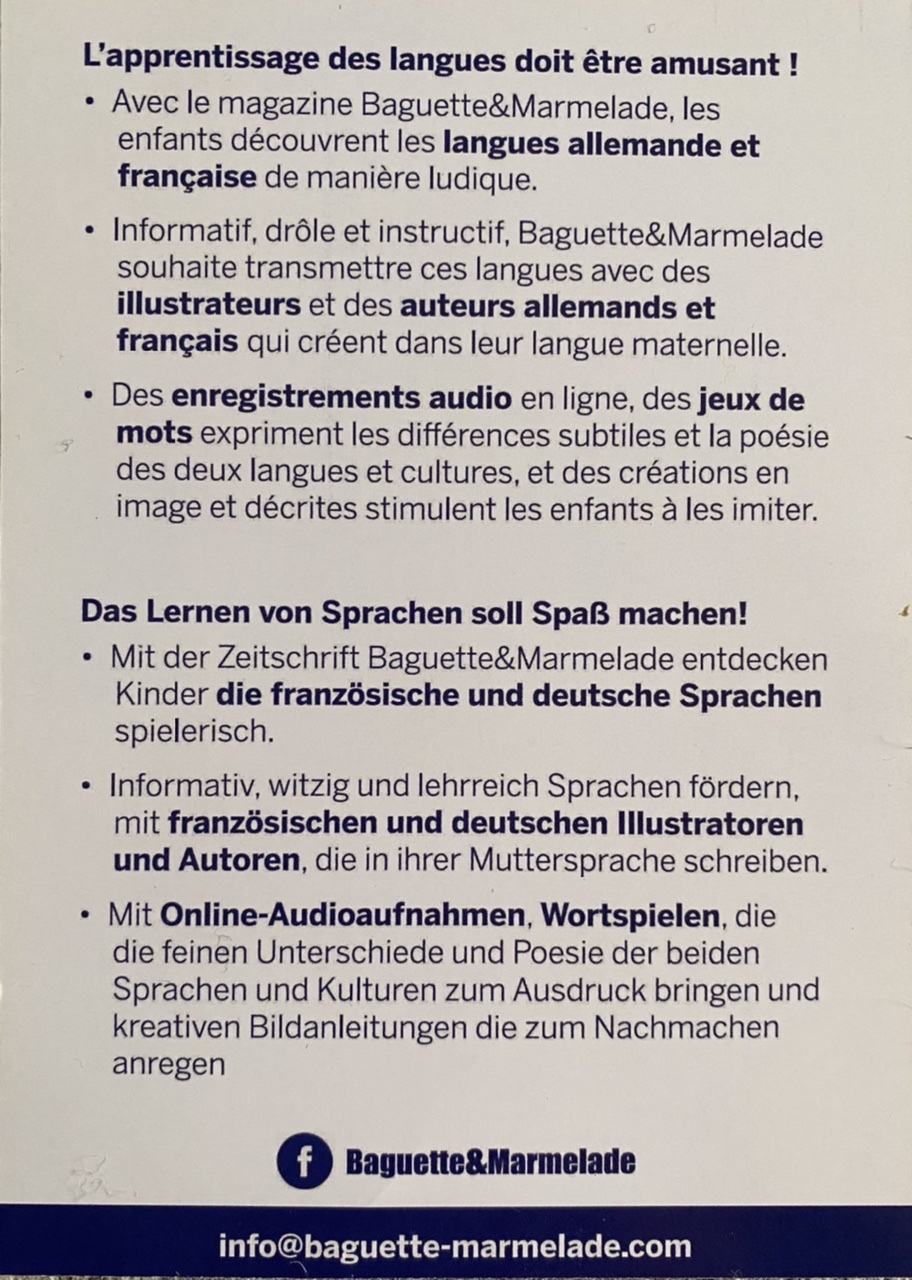 Le magazine Baguette&Marmelade se propose « d’amuser les enfants, d’aiguiser leur curiosité et de contribuer aux projets bilingues des espaces francophones et germanophones ». Il se découpe en 3 parties : lire/écouter, découvrir et expérimenter.