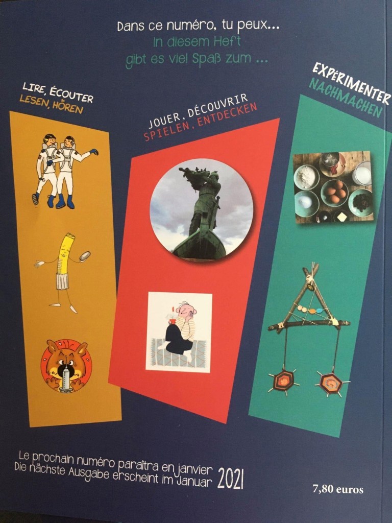 On y trouve, au rythme de belles pages rédigées en français ou en allemand, des histoires et des jeux, des légendes issues de l’un ou l’autre coté du Rhin (celle des Nibelungen dans le premier numéro), des bandes dessinées, des expressions et des recettes de cuisine typiques d’un pays ou de l’autre (vous apprendrez à faire du Kaiserschmarrn dans le numéro de septembre), des tutos bricolage et des idées d’albums à lire, bilingues ou en français ou en allemand…