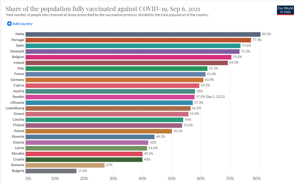 - 💉 Taux de vaccination dans les pays européens… en queue de peloton : des pays de l’est ! la Bulgarie va reimposer des restrictions plus sévères.