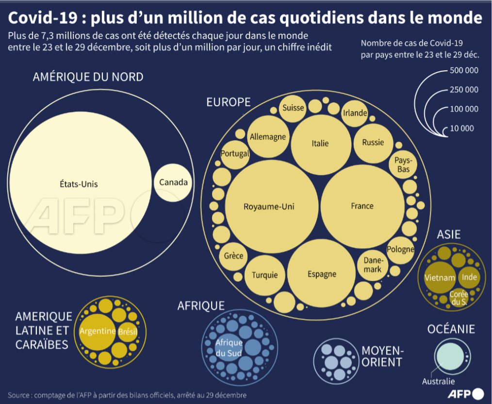 🦠 Le cap symbolique du million de contaminations quotidiennes par le Covid19 dans le monde a été franchi pour la première fois cette semaine, à quelques heures des festivités de Nouvel An sur lesquelles la pandémie pèsera une fois de plus #AFP #AFPGraphics