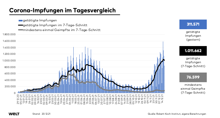 - VACCINATION : 941k doses de vaccin administrées le 20/12 (source RKI) -> 70,4% sont entièrement vacciné (73,6% en NRW), 73,5% ont reçu au moins une dose (77,3% en NRW), 32,6% ont reçu une 3e dose (35,6% en NRW)