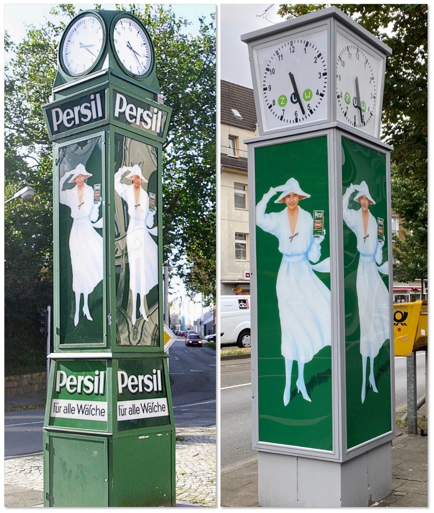 Avez-vous remarqué à Düsseldorf, au détour de rues plutôt fréquentées, ces horloges publicitaires d’un style très particulier et à laquelle de nombreux Allemands associent de vieux souvenirs ? on les appelle les Persil-Uhren.